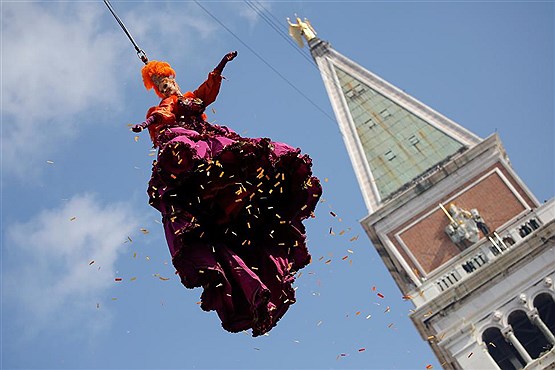 یک زن که لباس فرشتهها را پوشیده، طی مراسم کارناوال ونیز در میدان سینت مارک ونیز ایتالیا از آسمان فرود میآید