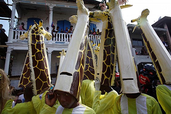 در کارنوال شهر «جکمل» هائیتی شرکت کنندکان ماسکهایی به شکل سر زرافه بر روی سرشان گذاشته اند